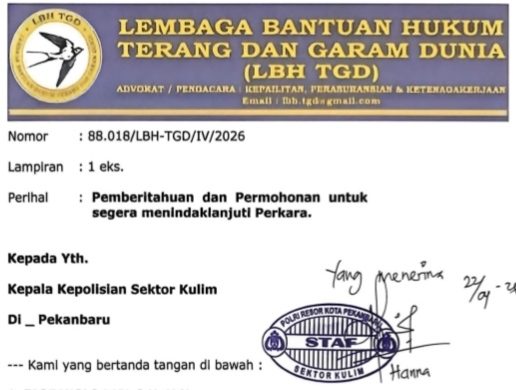 Dalam surat yang dikirim dari kantor LBH TGD di Jalan Indah Puri Ujung, Kelurahan Bencah Lesung, Kecamatan Tenayan Raya, pihak kuasa hukum menyoroti sejumlah poin penting terkait penanganan perkara.
