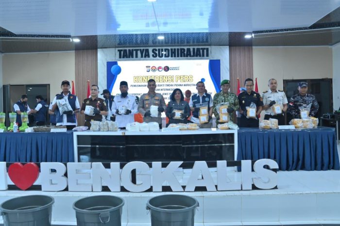 HarianUpdate.com | Bengkalis – Polres Bengkalis memusnahkan barang bukti narkotika hasil pengungkapan jaringan internasional dalam kegiatan konferensi pers yang digelar di Ruang Tantya Sudhirajati Polres Bengkalis, Rabu (8/4/2026).