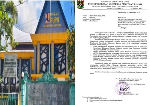 Untuk memperjelas informasi, media ini kembali melakukan konfirmasi kepada Plt Kadis PUPR Kabupaten Kampar, Afrudin Amga dan Salmi, pejabat PPID Kampar melalui WhatsApp messenger pada, Selasa (23/12/25) tidak mendapatkan jawaban dan penjelasan hingga berita ini diterbitkan.