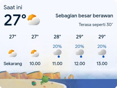 Teks foto: Prakiraan cuaca menunjukkan kondisi sebagian besar berawan dengan potensi hujan ringan sekitar 20 persen pada beberapa jam ke depan, Senin (9/2/2026). Ed/HUC