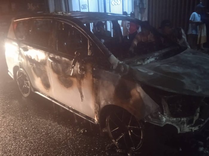 Satu unit mobil Toyota Innova Reborn warna putih dilaporkan terbakar hebat hingga sebagian besar bodi kendaraan hangus.