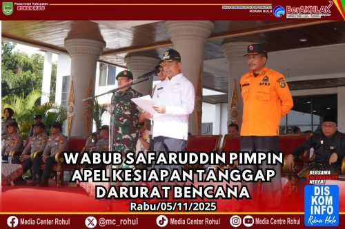 HarianUpdate.com | Rokan Hulu — Pemerintah Kabupaten Rokan Hulu menggelar apel kesiapan tanggap darurat bencana hidrometeorologi di halaman Kantor Bupati Rokan Hulu, Pasir Pengaraian. Apel tersebut dipimpin oleh Wakil Bupati Rokan Hulu H. Syafarudin Poti, SH, MM, dan dihadiri oleh Kapolres Rokan Hulu AKBP Emil Eka Putra, S.IK, MH, unsur Forkopimda, para asisten dan staf ahli Bupati, serta kepala OPD di lingkungan Pemkab Rohul, Rabu (5/11/25).